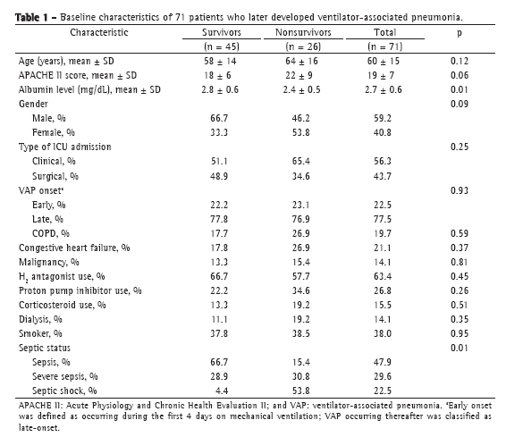 Pneumonia was classified as VAP when it occurred after 48 h on mechanical ventilation and was therefore judged not to have been incubating before the initiation of the mechanical ventilation. Early-onset VAP was defined as that occurring during the first 4 days on mechanical ventilation, whereas VAP developing thereafter was classified as late-onset.(10) Acute Physiology and Chronic Health Evaluation II (APACHE II) scores(11) were calculated within the first 24 h after ICU admission. Patients having received chemotherapy within the last 45 days were categorized as being immunosuppressed. A diagnosis of pneumonia was suspected when new, persistent infiltrate was seen on chest X-rays and at least two of the following were observed: a body temperature below 36°C or above 38°C; a white blood cell count lower than 4,000/mm3 or higher than 11,000/mm3; and macroscopically purulent tracheal aspirate. Tracheal aspirate was classified as purulent or nonpurulent after visual inspection by the clinical treatment team. The highest axillary temperature recorded during the 24 h preceding inclusion in the study was registered. Chest X-rays, arterial blood gas analyses, and complete blood counts, as well as the values of creatinine, total bilirubin, and albumin, were obtained for D0 and D4. Tracheal aspirate for quantitative culture had been obtained on D0, before antimicrobial treatment was started. For D0, we calculated the clinical pulmonary infection score (CPIS), modified as described by Singh et al.,(12) adding points for microbiological results and progression of pulmonary infiltrate seen on an additional chest X-ray taken on D3. Patients were assumed to have VAP when the CPIS was 7 or more. Patients received a diagnosis of VAP only after other medical conditions to which the presenting symptoms, signs or radiological findings could be attributed had been ruled out. Tracheal aspirate cultures yielding ≥ 105 CFU/mL were considered positive. For all patients in whom the clinical suspicion of VAP was confirmed, empirical antimicrobial therapy was started on D0. The antibiotic therapy was selected by the critical care team or primary care team, as were any decisions regarding changes in that therapy. The SOFA score was calculated for D0 and D4. The pre-sedation Glasgow Coma Score was used to evaluate the neurologic status in patients under sedation.(13) Modifications to the empirical therapy were based on the results of tracheal aspirate cultures and blood cultures. Airway management was performed in accordance with a standard protocol in all patients. At the time of VAP diagnosis, patients were classified as having sepsis, severe sepsis, or septic shock, as defined in international guidelines.(14) Patients were followed until D28, at which point crude mortality was assessed. Patients discharged from the ICU before D28 were classified as survivors. The records of all patients with VAP were reviewed by one of the investigators in order to confirm the diagnosis on the basis of predetermined criteria. The research protocol was reviewed and approved by the Human Research Ethics Committee of the HCPA. Written informed consent was obtained, prior to enrollment, from the representatives of the patients. The study protocol conforms to the ethical guidelines established in the Declaration of Helsinki. On D0, D3, D4, and weekly until D28, trained investigators collected data related to the following: age; gender; APACHE II score; SOFA score; CPIS; presence of COPD; smoking status; history of congestive heart failure; history of malignancy; immunosuppression; albumin level; use of H2 antagonists; proton pump inhibitor use; corticosteroid use; and the need for dialysis. Data related to the following factors were registered but are not shown here: cause of ICU admission; PaO2/FiO2 ratio; central venous catheterization; urinary tract catheterization; duration of mechanical ventilation; duration of stay in the ICU before VAP; cardiopulmonary resuscitation; intubation (orotracheal or nasotracheal); and tracheotomy. The appropriateness of the empirical antimicrobial treatment was determined on the basis of microbiological results. Appropriate antibiotic therapy was defined as coverage of all of the pathogens isolated (from tracheal aspirate cultures or blood cultures) by at least one antimicrobial administered at the onset of VAP, as determined by the sensitivity pattern observed in the antibiogram. Treatment was considered appropriate when cultures were negative. When a diagnosis of VAP was clinically suspected, blood was drawn before empirical antibiotic therapy was started. Immediately after the blood had been drawn, serum samples were prepared and stored at −80°C in the HCPA research laboratory. Assays were performed in batches at the end of the study period.