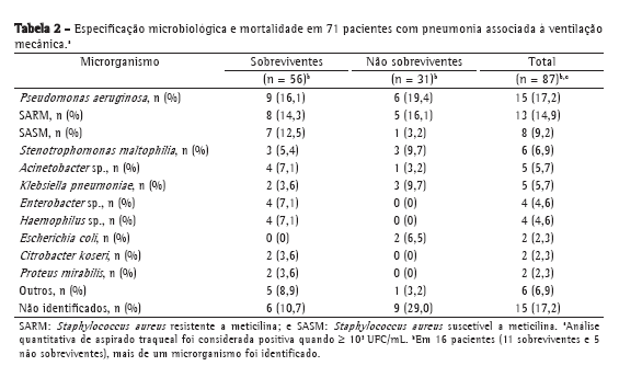 A especificação microbiológica por meio de cultura de aspirado traqueal revelou que os microrganismos mais comuns, tanto em sobreviventes como em não sobreviventes, foram Pseudomonas aeruginosa, Staphylococcus aureus (resistente a meticilina e suscetível a meticilina), Stenotrophomonas maltophilia, Acinetobacter sp., Klebsiella pneumoniae e Enterobacter sp. Em 16 pacientes (11 sobreviventes e 5 não sobreviventes), mais de um microrganismo foi identificado (Tabela 2).