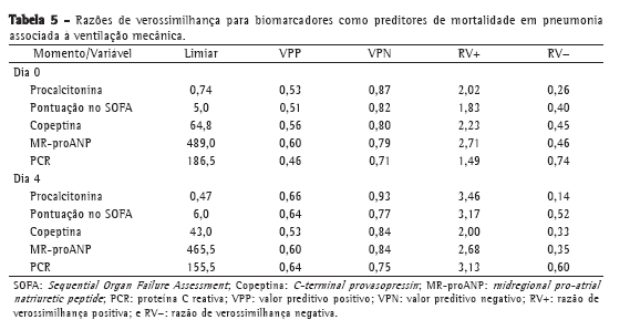 Objetivo: Níveis de procalcitonina, midregional pro-atrial natriuretic peptide (MR-proANP, pró-peptídeo natriurético atrial midregional),, C-terminal provasopressin (copeptina), proteína C reativa (CRP) e escore do Sequential Organ Failure Assessment (SOFA) são associados a gravidade e descritos como preditores de desfechos na pneumonia associada a ventilação mecânica (PAVM). Este estudo procurou comparar o valor preditivo de mortalidade desses biomarcadores na PAVM. Métodos: Estudo observacional com 71 pacientes com PAVM. Níveis de procalcitonina, MR-proANP, copeptina e PCR, bem como escore de SOFA foram obtidos no dia do diagnóstico de PAVM, designado dia zero (D0), e no quarto dia de tratamento (D4) Os pacientes receberam tratamento antimicrobiano empírico, com modificações baseadas nos resultados de cultura. Os pacientes que morreram antes de D28 foram classificados como não sobreviventes. Resultados: Dos 71 pacientes, 45 sobreviveram. Dos 45 sobreviventes, 35 (77,8%) receberam tratamento antimicrobiano adequado, comparados com 18 (69,2%) dos 26 não sobreviventes (p = 0,57). Os sobreviventes apresentaram valores significativamente mais baixos em todos os biomarcadores estudados, inclusive no escore de SOFA (exceto PCR) em D0 e D4. Em D0 e D4, a área sob a curva ROC foi maior para procalcitonina. Em D0, MR-proANP teve a maior razão de verossimilhança positiva (2,71) e valor preditivo positivo (0,60), mas a procalcitonina apresentou o maior valor preditivo negativo (0,87). Em D4, a procalcitonina apresentou a maior razão de verossimilhança positiva (3,46), o maior valor preditivo positivo (0,66) e o maior valor preditivo negativo (0,93). Conclusões: Os biomarcadores procalcitonina, MR-proANP e copeptina podem predizer mortalidade na PAVM, assim como o escore de SOFA. A procalcitonina tem o maior poder preditivo de mortalidade na PAVM.