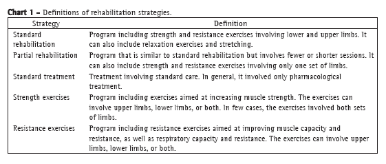 We searched five databases: PubMed; Web of Science; EMBASE; Cumulative Index to Nursing and Allied Health Literature; and LILACS. We selected articles published between 2005 and 2009, written in English, Spanish, or Portuguese. We combined COPD descriptors with various treatment descriptors that included the term "rehabilitation". This allowed us to find a larger number of articles. We applied inclusion and exclusion criteria in order to select articles that were in conformity with the principal objective of the present review. The articles were categorized by level of scientific evidence (grade of recommendation A, B, or C). In general, a grade A recommendation applies when the evidence is from randomized controlled clinical trials with a rich body of data. A grade B recommendation applies when the evidence is from randomized controlled clinical trials with limited body of data, whereas a grade C recommendation applies when the evidence is from observational studies or nonrandomized clinical trials. To provide a better understanding of the treatments described in the present review, we have defined them in Chart 1. In addition to the definitions shown in Chart 1, we used the term "baseline" or "baseline characteristics" to describe studies comparing parameters before and after pulmonary rehabilitation. Nonrandomized before-and-after studies were included in the present review because of the considerable number of such studies in the scientific literature on pulmonary rehabilitation. The results of the present review are presented by outcome of interest, namely pulmonary function, exacerbation, exercise capacity/tolerance, mortality, symptoms, and quality of life. For the outcomes exercise capacity/tolerance, quality of life, and symptoms, we created standardized figures. The remaining outcomes are presented exclusively as text. The figures show comparisons between standard rehabilitation (x axis) and other types of treatment (y axis). We present the number of analyses found for each comparison, as well as the levels of scientific evidence (grades of recommendation), adapted from the Global Initiative for Chronic Obstructive Lung Disease (GOLD) criteria.(2) We also present the results obtained with pulmonary rehabilitation, i.e., whether standard rehabilitation had positive or negative effects, or whether there were no differences between standard rehabilitation and a given treatment. The figures illustrate only the treatments that were classified as standard treatment (use of medications), partial rehabilitation (standard rehabilitation in fewer sessions, shorter sessions, or both), strength exercises, resistance exercises, or baseline. Systematic reviews and meta-analysis of the theme were not included in the analyses but were used in the considerations of the findings. The methods employed in the present systematic review are described in detail in the online supplement of the Journal