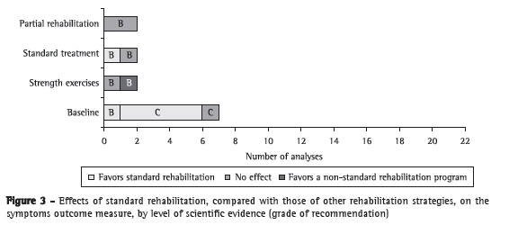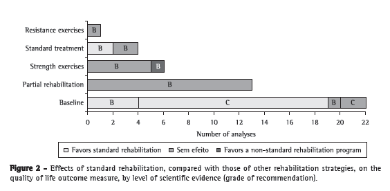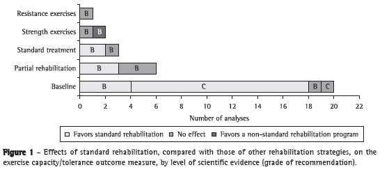 The articles selected generated 23 analyses of COPD exacerbation. Of those 23 analyses, 18 received a grade C recommendation. Nearly all of the analyses involved hospitalizations, emergency room visits, or consultations with health professionals. Standard rehabilitation was the type of treatment that was most commonly evaluated (in 22 of the 23 analyses), having been compared either with baseline data or with the standard treatment. In 15 of the 18 analyses comparing baseline data with data obtained after standard rehabilitation, standard rehabilitation was shown to have positive effects on COPD exacerbations, most of the analyses having involved patients with moderate to very severe COPD.(18,36-38) The analyses that showed no differences between baseline data and those obtained after standard rehabilitation evaluated the length of hospital stay,(38) emergency room visits, and the number of visits by nursing teams.(39) In 4 analyses, the standard treatment was compared with standard rehabilitation. Of those, only 1 showed improvement, the hospital stay having been shorter six months after the end of the intervention.(10) Finally, 1 analysis showed that resistance exercises combined with tiotropium use reduced the need for rescue medications when compared with the use of resistance exercises in isolation.(17)