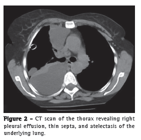 A chest X-ray demonstrated significant right-sided pleural effusion (Figure 1), and a CT scan of the chest revealed right pleural effusion, thin septa, and atelectasis of the underlying lung (Figure 2). Serum levels of urea and creatinine were 132 mg/dL and 3.9 mg/dL, respectively. Because the respiratory distress developed suddenly and soon after percutaneous nephrolithotomy, urinothorax was suspected. The diagnosis was confirmed after thoracocentesis, which yielded approximately 1,100 mL of pleural fluid, with a ratio between the creatinine content in pleural fluid and that in serum of 1.78 (normal, < 1). A 28 Fr chest tube was inserted into the right fifth intercostal space in order to drain the effusion.