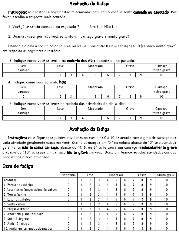 Versão modificada do Pulmonary Functional Status and Dyspnea QuestionnaireO PFSDQ-M é composto por três domínios: influência da dispnéia nas AVD, influência da fadiga nas AVD (5 itens gerais e 10 específicos para cada domínio) e mudança nas AVD em comparação ao período anterior à doença (10 itens específicos).(10) O paciente relata o quanto a dispnéia e a fadiga interferem nos 10 itens específicos de AVD, escolhendo para cada atividade um valor entre 0 e 10: 0 (nenhuma interferência), 1-3 (leve), 4-6 (moderada), 7-9 (grave) e 10 (muito grave). No terceiro domínio, o paciente relata de quanto foi a mudança nas AVD em comparação ao período anterior à doença, escolhendo para cada atividade um valor entre 0 e 10: 0 (tão ativo como sempre em relação a essa atividade), 1-3 (pequena mudança), 4-6 (mudança moderada), 7-9 (mudança extrema) e 10 (não faz mais essa atividade). Um escore parcial é calculado, variando de 0 a 100 para cada um dos três domínios (dispnéia, fadiga e mudança nas AVD), e um escore total é formado pela soma dos escores parciais dos três domínios, totalizando um valor que varia de 0 a 300. Valores mais altos na escala indicam maior limitação nas AVD. As cinco questões gerais nos domínios dispnéia e fadiga são de caráter informativo e qualitativo, e suas respostas não são contabilizadas na pontuação do questionário (Anexo 1).