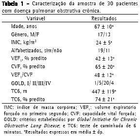 Os pacientes foram recrutados durante a avaliação inicial para entrada em um programa de reabilitação pulmonar no Hospital Universitário Regional Norte do Paraná (HURNPR), Londrina, Brasil. As características da amostra estão descritas na Tabela 1. O diagnóstico de DPOC foi feito de acordo com critérios determinados pelo Global Initiative for Chronic Obstructive Lung Disease,(1) aceitos internacionalmente. O tamanho da amostra foi definido com base nos estudos de validação da versão em língua portuguesa do SGRQ.(13,15) Além do diagnóstico de DPOC, foram considerados os seguintes critérios de inclusão: condição estável, sem exacerbações ou infecções nos últimos três meses; ausência de cardiopatia severa ou instável; e ausência de outras condições patológicas que pudessem influenciar no desempenho das AVD (por exemplo, doença cerebrovascular, ortopédica ou reumática). Os critérios de exclusão foram os seguintes: ocorrência de exacerbação aguda durante o período das avaliações e a falta de compreensão ou de colaboração com relação aos questionários e aos outros métodos de avaliação, de acordo com o julgamento subjetivo do aplicador dos instrumentos e testes. O estudo contou com a aprovação do Comitê de Ética em Pesquisa da Universidade Estadual de Londrina - HURNPR, e os dados foram coletados de fevereiro a setembro de 2007. Todos os pacientes deram consentimento formal para sua participação no estudo ao assinar um termo de compromisso esclarecido antes de sua inclusão.
