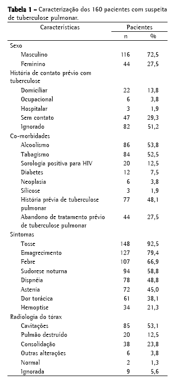 ResultadosNo período entre janeiro de 2001 e janeiro de 2002 foram avaliados 161 pacientes com suspeita de TB pulmonar e coletada uma amostra de escarro por paciente. Ocorreu uma perda devido à amostra com volume insuficiente. A idade média dos 160 pacientes incluídos foi de 40,0 ± 12,8 anos (variação, 19-78 anos). As características gerais dos mesmos encontram-se descritas na Tabela 1.