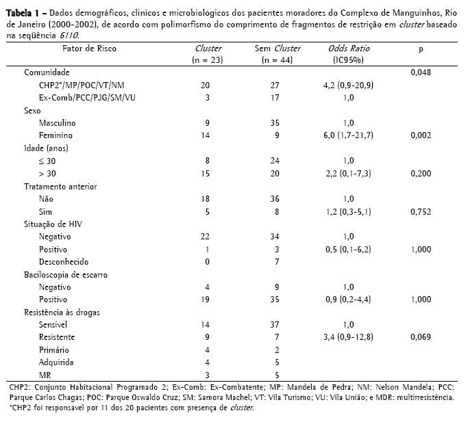As características clínicas e demográficas dos pacientes analisadas pelo fator de risco (Tabela1), de acordo com os padrões do RFLP e dos isolados de M. tuberculosis, mostraram que morar em comunidades faveladas como o CHP2, a Mandela de Pedra, o Parque Oswaldo Cruz, a Vila Turismo e Nelson Mandela aumentou em 4 vezes a probabilidade de presença de cluster em comparação a outras comunidades (OR = 4,2; IC95%: 0,9-20,9; p = 0,048), apesar da maior parte dos pacientes com cluster (11/23, 47,8%) terem sido identificados no CHP2. Ser do sexo feminino teve forte correlação com a presença de cluster (OR = 6,0; IC95%: 1,7-21,7; p = 0,002). Apesar de não ter havido associação significativa entre a presença de cluster e resistência a drogas (OR = 3,4; IC95%: 0,9-12,8; p = 0,069), deve-se ter em mente que 40% dos clusters incluíam cepas com resistência primária, totalizando 26% (6/23) dos pacientes com presença de cluster (Tabela 2).