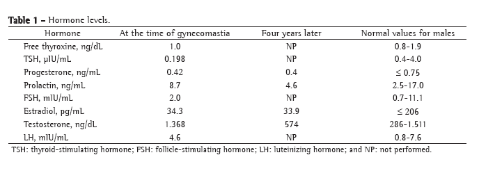 Hormone levels were normal (Table 1). A mammogram revealed bilateral gynecomastia, more extensive on the right.