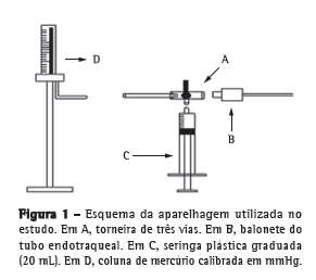 Para se utilizar o método VMO nos pacientes admitidos, esses foram posicionados em supino, com o pescoço em posição neutra, e tiveram a sua cavidade orofaríngea higienizada e aspirada. Em seguida, o cuff foi desinsuflado e inflado com uma seringa de 20 mL, acoplada a uma torneira de três vias. Em relação às outras duas vias da torneira, uma estava adaptada ao balonete do tubo endotraqueal, e a outra estava acoplada a uma coluna de mercúrio, calibrada em mmHg (Figura 1). O cuff foi inflado até o momento em que os ruídos adventícios auscultados por um estetoscópio acoplado sobre a fúrcula esternal do paciente eram abolidos, momento em que se realizou a leitura no manômetro de mercúrio.(3) Para a análise dos dados, utilizou-se o teste t de Student para uma única amostra, considerando significativos valores de p < 0,05.