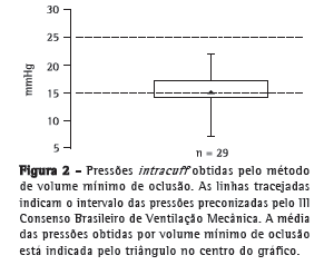 Com o objetivo de comparar as pressões intracuff que podem ser obtidas pela técnica VMO com as pressões preconizadas pelo III CBVM, foi realizado um estudo descritivo e prospectivo entre agosto e dezembro de 2011, na UTI de Adultos do Hospital de Clínicas da Universidade Estadual de Campinas. O estudo foi aprovado pelo Comitê de Ética e Pesquisa da Faculdade de Ciências Médicas da Universidade Estadual de Campinas (nº 542/2011). Foram realizadas mensurações de pressão intracuff utilizando a técnica VMO em 29 pacientes adultos em ventilação mecânica. Foram incluídos no estudo pacientes com idade superior a 18 anos, de ambos os gêneros, em ventilação mecânica por um tempo menor que 48 h e portando um tubo endotraqueal com cuff de alto volume e baixa pressão. Foram excluídos os pacientes com história de intubação pregressa.