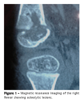 A female infant (age, 2 years and 4 months) from the city of São Paulo, Brazil, had been vaccinated with BCG in the maternity ward and presented with a 15-day history of pain in the right leg and impaired ambulation. The patient was treated with a nonsteroidal anti-inflammatory drug and showed improvement. However, two weeks after the drug had been discontinued, she showed worsening. An X-ray of the knee showed an osteolytic lesion in the right distal femoral epiphysis. Magnetic resonance imaging (Figure 1) revealed a centromedial lesion in the right distal femoral epiphysis, with multiple areas of cortical erosion; there was significant cortical discontinuity, and there was no effusion in the posteroinferior portion of the medial femoral condyle. The patient was treated with ceftriaxone for 14 days, with no improvement. A punch biopsy of the right knee showed a granuloma with no AFB. The patient was started on isoniazid, rifampin, and pyrazinamide. Investigation of her parents, siblings, and nannies showed no exposure to pulmonary or extrapulmonary tuberculosis. At admission to our facility, a few days after treatment initiation, the patient was in good general health. The only abnormality on physical examination was right knee edema (distal and proximal to the tibia). The edema was cold and painful on palpation, being accompanied by functional disability.