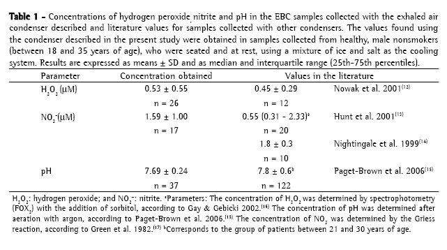 Chemical determinationsVarious parameters, such as markers of inflammation, remodeling and tissue oxidative damage, have been determined in EBC samples.(2,3) Using the EBC condenser described in the present study, the concentrations of hydrogen peroxide, nitrite and pH were determined by different methods (Table 1), as were the concentrations of malondialdehyde,(7) 8-isoprostane and protein (data not shown). Although our condenser was not directly compared with others, the values revealed by the chemical analysis of the samples collected using the EBC condenser described here are at a level similar to previously reported values obtained using other condensers in healthy subjects (Table 1). In the future, this comparison should be carried out in order to allow a statistical analysis, which was not performed in the present report.