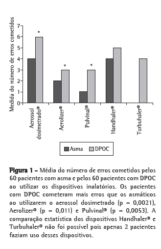 Dos dispositivos testados, foi encontrado um maior número de erros no uso de aerossol dosimetrado, Aerolizer® e Pulvinal®, nessa ­sequência. Devido ao pequeno número de pacientes que faziam uso de Turbuhaler® e Handhaler®, os resultados referentes a esses dispositivos devem ser analisados com cautela. Apesar da diferença no número de erros no uso dos dispositivos, não é possível, neste estudo, relacionar esse achado com o controle clínico dos pacientes. Se possível, deve-se evitar a utilização de dispositivos diferentes para um mesmo paciente.(27)