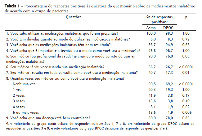 Comparando as respostas obtidas nos dois grupos, cinco questões apresentaram diferenças significativas entre suas respostas. O grupo asma, em comparação com o grupo DPOC, relatou que, com mais frequência, o médico (ou outro profissional de saúde) já havia ensinado o modo correto do uso da medicação (p = 0,05), havia visto o paciente usar corretamente a medicação (p < 0,0001), reavaliava em toda consulta o uso da medicação (p = 0,01) e já havia visto o paciente utilizando a medicação cinco vezes ou mais (p = 0,005). Além disso,