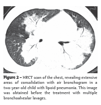 Lipoid pneumonia (LP) is not easily diagnosed, since its clinical and radiological findings are similar to those of bacterial pneumonia and TB. Caused by the aspiration of fat substances from endogenous or exogenous sources, LP results in a proliferative, chronic interstitial inflammation of the lung parenchyma. It was first described by Laughlen in 1925,(1) when the author observed the presence of oil in the lungs of 3 autopsied children and of 1 autopsied adult. The most common cause of LP is the aspiration of mineral oil, which is often used in the treatment of intestinal constipation.(2) The high viscosity of mineral oil can inhibit the cough reflex, facilitating the aspiration of oil to the lower airway, even in the absence of risk factors, especially in suckling infants, because of the way in which they are positioned during feedings. Other known risk factors for LP are structural and functional disturbances of the gastrointestinal tract, neurological and muscular diseases that affect respiration and swallowing, comma and anesthesia, as well as accidental and forced oil ingestion.(3-5) The cultural practice, in certain countries (Mexico, Arabia, India and Guatemala), of using oily substances for the body hygiene of suckling infants and for nasal clearance might also be associated with the development of LP.(4,6-8) In Brazil, mineral oil is still often used for the treatment of intestinal constipation and partial bowel obstruction caused by severe ascariasis.(9)
