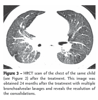 Bronchoscopy was performed using a flexible bronchoscope (FB Olympus 3C-40, Tokyo, Japan), with intravenous sedation (midazolam) and the placement of an oxygen catheter; SpO2 and heart rate were monitored. After inspection of the tracheobronchial tree, the bronchoscope was introduced into the affected segment or lobe, which had been identified in the HRCT scan. The lavage consisted in introducing three aliquots of sterile saline solution (each 1 mL/kg of body weight) warmed to 37°C, followed by immediate aspiration. The first aliquot was set aside for microbiological study and the remaining aliquots were collected in a single vial for cell analysis. Cellularity was determined using a Neubauer chamber. The cell suspension was centrifuged for 5 min at 200 × g (Cytopro; Wescor, Logan, UT, USA) for staining with Sudan, periodic acid-Schiff and May-Grünwald-Giemsa. The therapeutic BAL was performed weekly with five aliquots of 1 mL/kg of body weight of sterile saline solution warmed to 37°C, until the BAL fluid was nearly transparent with cellularity within the normal limits.(10)