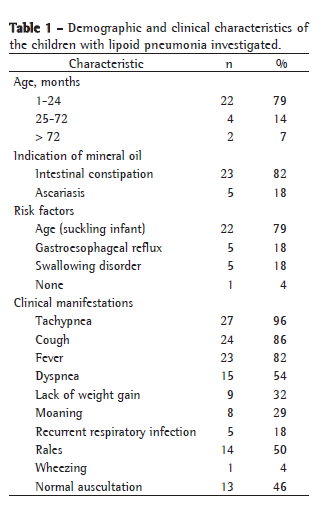 A total of 28 children were evaluated for 24 months (15 females and 13 males). Age ranged from 1 to 108 months (mean = 20 months; median = 5.5 months). All of the children had used mineral oil as treatment for intestinal constipation (23/28) or partial bowel obstruction by Ascaris lumbricoides (5/28), for a mean period of 32 days (median = 15 days). Nearly all children (27/28) presented respiratory and other symptoms, including tachypnea, cough, fever, dyspnea, lack of weight gain, moaning and recurrent respiratory infection (Table 1). The most common laboratory alterations were neutrophilia (85%), leukocytosis (73%), eosinophilia (11%) and elevated erythrocyte sedimentation rate (58%). The blood workup was normal in 2 children. The mean time between the onset of symptoms and the diagnostic bronchoscopy was 38 days. Regardless of the treatments for bacterial pneumonia or TB, the chest X-rays remained unaltered until the bronchoscopy was performed.