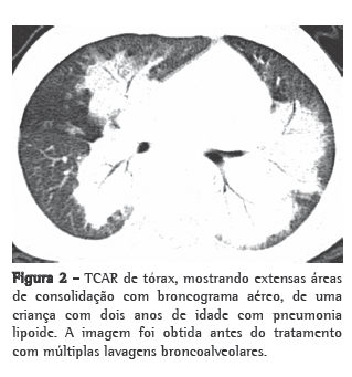 A pneumonia lipoide (PL) não é facilmente diagnosticada, pois os achados clínicos e radiológicos simulam os da pneumonia bacteriana e da TB. A PL ocorre devido à aspiração de substâncias gordurosas de fontes endógenas ou exógenas, resultando numa inflamação intersticial crônica e proliferativa do parênquima pulmonar. A PL foi primeiramente descrita por Laughlen em 1925,(1) ao observar, em necropsias de três crianças e um adulto, a presença de óleo nos pulmões. A causa mais comum de PL é a aspiração de óleo mineral, muito utilizado no tratamento da constipação intestinal.(2) A alta viscosidade do óleo mineral pode inibir o reflexo da tosse, facilitando sua aspiração para a via aérea inferior mesmo na ausência de fatores de risco, especialmente nos lactentes, devido à posição em que se alimentam. Outros fatores de risco conhecidos são os distúrbios estruturais e funcionais do trato gastrointestinal, doenças neurológicas e neuromusculares que comprometem a respiração e a deglutição, estados de coma, anestesia, além da ingestão acidental e forçada.(3-5) A prática cultural em alguns países (México, Arábia, Índia, Guatemala) na utilização de substâncias oleosas na higiene corporal dos lactentes e na desobstrução nasal também está associada com o desenvolvimento de PL.(4,6-8) No Brasil, o óleo mineral ainda é muito utilizado no tratamento da constipação intestinal e na suboclusão intestinal por ascaridíase maciça.(9)