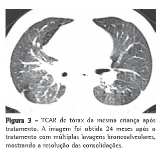 Das 28 crianças, 20 foram tratadas com múltiplas lavagens broncoalveolares (média = 9,35 lavagens; variação: 4-22), tornando-se assintomáticas após o tratamento; além disso, 18 crianças apresentaram TC normal logo após o tratamento, 1 evoluiu com imagem cística no pulmão direito, e outra evoluiu com discreta área de atelectasia segmentar 12 meses após o tratamento. Seis crianças abandonaram o acompanhamento.