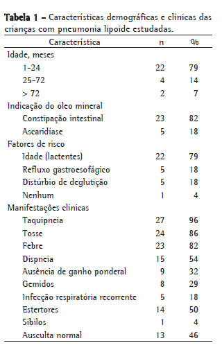 Foram avaliadas, durante 24 meses, 28 crianças (15 do sexo feminino, 13 do sexo masculino) com idades variando entre 1 e 108 meses (média = 20 meses, mediana = 5,5 meses) que utilizaram óleo mineral como tratamento para constipação intestinal (23/28) ou para suboclusão intestinal por Ascaris ­lumbricoides (5/28), por um período médio de 32 dias (mediana = 15 dias). As crianças (27/28) eram sintomáticas respiratórias e apresentavam, principalmente, taquipneia, tosse, febre, dispneia, ausência de ganho ponderal, gemidos e infecção respiratória recorrente (Tabela 1). As alterações laboratoriais mais observadas foram neutrofilia (85%), leucocitose (73%), eosinofilia (11%) e velocidade de hemossedimentação elevada (58%). Duas crianças apresentaram hemograma normal. O tempo médio entre o início dos sintomas e a realização da broncoscopia diagnóstica foi de 38 dias, e, apesar do tratamento instituído para pneumonia bacteriana e/ou TB, as radiografias de tórax mantiveram-se inalteradas até a realização da broncoscopia.