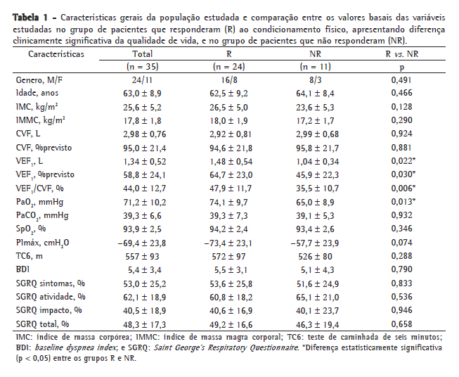 Objetivo: Investigar os fatores associados à diferença clinicamente significativa da qualidade de vida (DCSQV) após condicionamento físico em pacientes com DPOC. Métodos: Trinta e cinco pacientes foram submetidos a 12 semanas de condicionamento físico, envolvendo treinamento de força e exercício aeróbio leve. Composição corporal, teste incremental e de endurance em esteira, teste de caminhada de seis minutos, força muscular periférica, PImáx, baseline dyspnea index (BDI) e Saint George's Respiratory Questionnaire (SGRQ) foram avaliados antes e após o treinamento, e suas alterações (Δ) foram calculadas. A DCSQV foi definida como a redução ≥ 4% no escore total do SGRQ. Os pacientes que responderam ao treinamento, apresentando DCSQV, foram alocados no grupo respondedores (R; n = 24), e os demais pacientes foram alocados no grupo não-respondedores (NR; n = 11). Resultados: Os seguintes resultados foram significativamente maiores no grupo R que no grupo NR (p < 0,05): VEF1 (1,48 ± 0,54 L vs. 1,04 ± 0,34 L), VEF1/CVF (47,9 ± 11,7% vs. 35,5 ± 10,7%), PaO2 (74,1 ± 9,7 mmHg vs. 65,0 ± 8,9mmHg) e ΔBDI [mediana (interquartil); 2,0 (0,0-3,5) vs. 0,0 (0,0-1,0)]. Houve correlação significativa (p < 0,01) de ΔSGRQ-sintomas (r = 0,44), ΔSGRQ-atividade (r = 0,62) e ΔSGRQ-total (r = 0,60) com ΔBDI. Após regressão logística, apenas ΔBDI foi selecionado como determinante da DCSQV. Conclusões: A DCSQV após o condicionamento físico está associada principalmente à redução da dispneia nos pacientes com DPOC. Portanto, são necessárias estratégias de tratamento visando interromper o ciclo dispneia-sedentarismo-dispneia nesses pacientes.