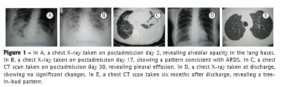 The patient's condition improved slowly. A transnasal fiberoptic laryngoscopy performed when the tracheostomy tube was removed revealed no abnormalities. On postadmission day 78, the patient was discharged on diazepam and fluoxetine; chest X-ray revealed no parenchymal changes (Figure 1D). At the six-month follow-up evaluation, the patient had no respiratory complaints, and a chest CT scan (Figure 1E) revealed the following: thoracic asymmetry favoring the left chest; an asymmetric, diffuse pattern (of little significance) on both sides, with ground-glass areas alternating with hypertransparent areas; scar-like lines at right angles to the pleural surface in the upper and middle lobes; and only a few areas exhibiting a tree-in-bud pattern. The patient was uncooperative during the spirometry test; peak flow was normal (380 L/min).