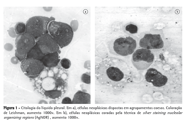 Oito meses após a cirurgia, apresentou recidiva local (cavo axilar direito) e metástase para o pulmão. Evoluiu com dispneia progressiva e dor na articulação coxofemoral esquerda. O exame físico e radiológico (TC de tórax) evidenciou derrame pleural volumoso à direita, com frequentes nódulos pleurais. O derrame foi drenado e a análise do líquido pleural demonstrou características de exsudato (proteínas: 4,2 g/dL e desidrogenase lática: 2.456 UI/L) com citologia oncótica positiva para células neoplásicas dispostas em agrupamentos coesos, sem sobreposição, sugerindo tratar-se de linhagem neuronal (Figura 1). O estudo tomográfico do abdome e pelve mostrou metástase tumoral em osso e músculo ilíaco direito. O aspirado de medula óssea mostrou infiltração medular. O paciente permanece até esta data em quimioterapia paliativa.