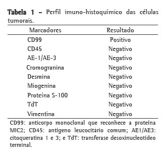 No caso em questão, apenas o CD99 foi positivo. Entretanto, o quadro clínico e o aspecto morfológico e estrutural das células tumorais foram fundamentais para a definição diagnóstica.