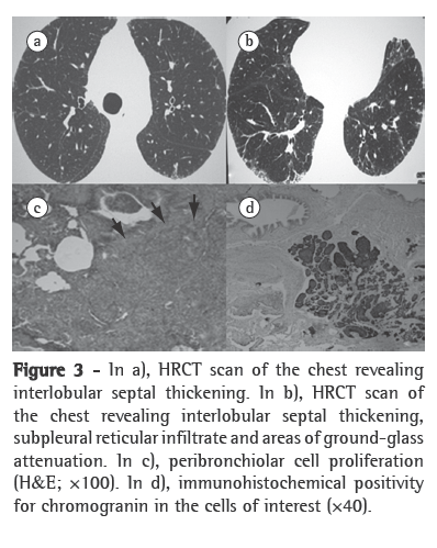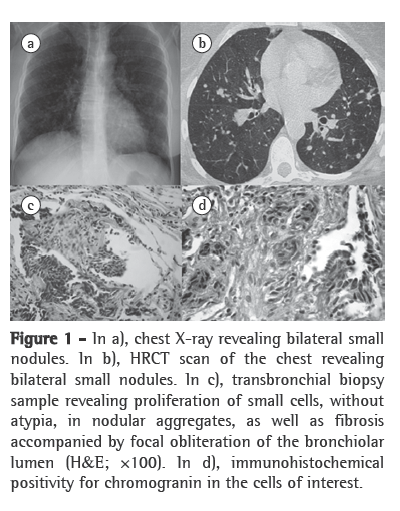 The histological findings revealed proliferation of small cells, without atypia, located in the airway walls and forming nodular aggregates that tested positive for epithelial markers (carcinoembryonic antigen and CK7) and neuroendocrine markers (chromogranin and synaptophysin), as determined by immunohistochemistry (Figure 1d). There was concomitant fibrosis, accompanied by focal obliteration of the bronchiolar lumen, as well as mild chronic inflammatory infiltrate and focal bronchiolectasis.