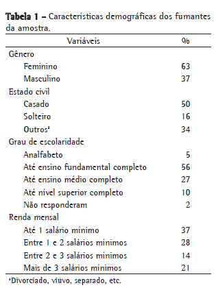 ResultadosForam avaliados 387 tabagistas, com idade média de 50 ± 25 anos (faixa etária: 19-74 anos), 63% do sexo feminino, 30% provenientes de Botucatu, 48% provenientes de outras cidades da região e 22% de outras regiões do estado. As características demográficas da população estudada estão apresentadas na Tabela 1. A maioria era do gênero feminino (63%), casado (50%) e não tinha cursado o segundo grau (61%). Analisando a renda mensal dos fumantes, verificamos que a maioria recebia até dois salários mínimos. O grau de dependência foi elevado ou muito elevado (Fagerström > 6) em mais da metade dos tabagistas.