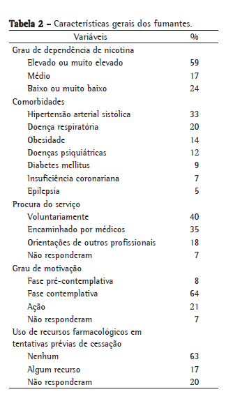 A maioria dos pacientes procurou o serviço voluntariamente, encaminhados por médicos ou por outros profissionais de saúde. O tempo médio de tabagismo foi de 31 ± 12 anos, e mais da metade dos pacientes estava na fase contemplativa quando foi avaliado o grau de motivação para parar de fumar. A maioria (78%) referiu tragar sempre a fumaça do cigarro, 14% tragavam às vezes ou nunca, e 8% não responderam. A maioria dos tabagistas avaliados em nosso estudo (68%) tinha feito pelo menos uma tentativa de cessação do tabagismo previamente, com um valor médio de tentativas de cessação de 1,2 ± 1,2 vezes. O número de pacientes que tinham recebido tratamento farmacológico durante as tentativas anteriores foi de apenas 17%.