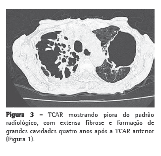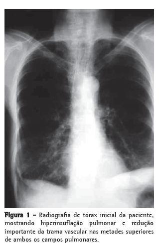 Encontrava-se em uso de levotiroxina, calcitriol e prednisona 15 mg/dia, mas já havia feito uso de metotrexato previamente. Ao exame físico, apresentava-se emagrecida (30 kg de peso e índice de massa corpórea de 14 kg/m2), sem linfonodomegalia cervical ou supraclavicular e sem baqueteamento digital. A ausculta pulmonar revelou apenas murmúrio vesicular reduzido difusamente. A radiografia de tórax no início do quadro, há 4 anos, mostrava hiperinsuflação pulmonar e redução importante da trama vascular nas metades superiores de ambos os campos pulmonares (Figura 1), e a TCAR realizada revelara enfisema parasseptal, cavidades e destruição do parênquima com predomínio nos lobos superiores (Figura 2). A gasometria arterial e o teste tuberculínico não revelaram anormalidades. A espirometria mostrou distúrbio ventilatório obstrutivo incipiente, sendo iniciado tratamento com formoterol. No último ano, com a piora dos sintomas, a paciente foi submetida à nova TCAR, que mostrou piora do padrão radiológico (Figura 3). A baciloscopia direta do escarro foi negativa para BAAR. O método Gomori-Grocott com prata metenamina evidenciou formas leveduriformes intracelulares, e as culturas das amostras de escarro e do lavado broncoalveolar em ágar dextrose Sabouraud revelaram a presença de Histoplasma capsulatum. Foi iniciado tratamento com itraconazol, 200 mg/dia.(8) A paciente encontra-se em acompanhamento ambulatorial com melhora sintomática e aumento de peso.