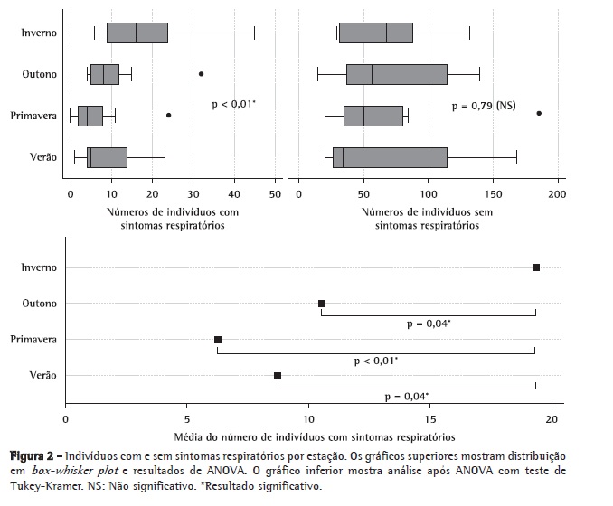 A relação entre as variáveis meteorológicas e o número de indivíduos com e sem sintomas respiratórios pode ser vista na Figura 1. A inspeção visual da regressão LOWESS identificou uma possível associação de baixos níveis de umidade relativa do ar, temperaturas mais baixas e baixos níveis de precipitação coincidindo com um aumento do número de indivíduos com sintomas respiratórios durante o inverno (Figura 1). Um aumento da velocidade do vento também foi verificado durante o inverno. Entretanto, um padrão similar de aumento de velocidade também foi visto na primavera e esse não foi associado a um aumento do número de indivíduos com sintomas respiratórios (Figura 1). Por ANOVA, verificou-se uma diferença estatisticamente significativa (p < 0,01) somente para os indivíduos com sintomas respiratórios (teste de Bartlett; p = 0,08). O teste de Tukey-Kramer mostrou que a média do número de indivíduos com sintomas respiratórios no inverno foi significativamente diferente daqueles nas outras estações (Figura 2). Houve diferenças estatisticamente significativas na comparação das médias do número de indivíduos com sintomas respiratórios por estação usando ANOVA em todas as faixas etárias (p = 0,02; p = 0,02; e p = 0,03 em crianças, adolescentes e adultos, respectivamente), exceto nos idosos (p = 0,20). O teste de Tukey-Kramer após ANOVA mostrou que a média do número de crianças com sintomas respiratórios no inverno foi significativamente diferente daqueles nas outras estações (p = 0,04); no caso dos adolescentes e dos adultos, apesar de as médias desses com sintomas respiratórios terem sido maiores no inverno do que nas outras estações, essas foram significativamente diferentes em relação ao verão e à primavera, mas não em relação ao outono (p < 0,05).