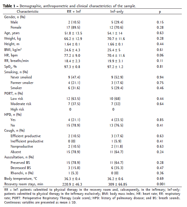The patients were divided into two groups: patients submitted to physical therapy in the recovery room and, subsequently, in the infirmary (RR+Inf group); and patients submitted to physical therapy in the infirmary exclusively (Inf-only group).