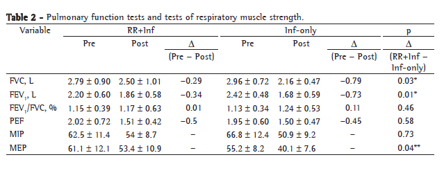 In our study, we found a significant postoperative reduction in respiratory muscle strength (MEP) in both groups evaluated. Postoperative MIP was significantly reduced in both groups. Although the reduction in muscle strength was greater in the Inf-only group than in the RR + Inf group, the difference was not significant. Another group of authors reported alterations in ventilatory muscle strength in patients submitted to abdominal surgery. This reduction, according to the authors, is due to postoperative pain, since the group that received analgesic therapy in the study period presented less alteration in ventilatory muscle strength.(13) According to some authors, pulmonary complications after abdominal surgery can be prevented by performing inspiratory muscle training in the preoperative period, there being a reduction in the incidence of atelectasis after the procedure.(1)