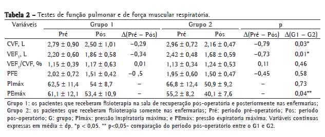 Em relação à força muscular respiratória, observou-se uma redução significativa na PEmáx no pós-operatório quando realizada a comparação intergrupos, evidenciando que o atendimento fisioterapêutico na SRPA preserva a queda na força muscular respiratória.