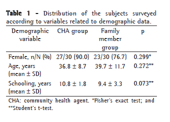 As for the gender of the interviewees, it was observed that, of the 30 CHAP representatives, 27 (90.0%) were female, as were 23 (76.7%) of their family members (p = 0.299). The mean age of the CHAP representative group was 36.8 ± 8.7 years (range, 20-58 years), compared with 39.7 ± 11.7 years (range, 16-73 years) in the family member group. The mean level of education among the CHAP representatives was 10.8 ± 1.8 years of schooling, higher than the 9.4 ± 3.3 years of schooling among the family members (Table 1).