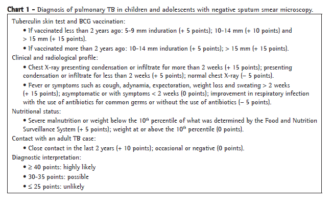 11. Maciel EL, Dietze R, Silva RE, Hadad DJ, Struchiner CJ. Evaluation of a scoring system recommended by the Brazilian Ministry of Health for the diagnosis of childhood tuberculosis [Article in Portuguese]. Cad Saúde Pública. 2008;24(2):402-8.
