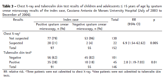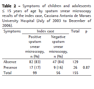 Based on this information, the Programa de Controle da Tuberculose do Hospital Universitário Cassiano Antonio de Moraes (PCT/HUCAM, Tuberculosis Control Program of the Cassiano Antonio de Moraes University Hospital) has been developing measures, since 2003, related to TB control in this age bracket. One of these measures is the evaluation of contacts aged 15 or younger. In this context, we conducted this study at the PCT/HUCAM, in order to compare clinical, radiological and laboratory aspects of children and adolescents who had been in contact with patients presenting positive or negative sputum smear results for Mycobacterium tuberculosis and positive culture results.