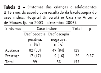 Os sinais e sintomas de TB são extremamente variados e vão desde formas assintomáticas até formas graves disseminadas, com emagrecimento importante e evolução para o óbito.(23) No presente trabalho, 26 crianças (16,8%) possuíam sintomas de TB. Em um estudo realizado no Rio de Janeiro,(16) 25% (46/181) das crianças eram sintomáticas, e a tosse foi o sintoma mais frequente. Em nosso estudo, ao comparar a presença de sintomas nos grupos, observamos que 17% e 16%, nos grupos exposto e não-exposto, respectivamente, eram sintomáticos, não havendo diferença estatística significativa (p = 0,86). O emagrecimento foi o sintoma mais relatado (38%), seguido da tosse (27%).