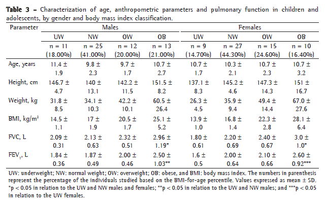 The objective of the present study was to compare FEV1 and FVC, calculated using the three sets of reference equations mentioned above, and to determine whether the three are similar in predicting lung function in children and adolescents with distinct BMIs and without impairment of the respiratory system or of any other system.