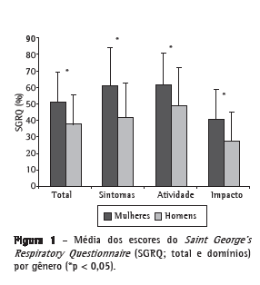Os resultados desse estudo mostraram que, para um grau similar de obstrução ao fluxo aéreo, as mulheres com DPOC apresentaram um maior comprometimento do ES que os homens em todos os domínios do SGRQ. As diferenças médias entre os gêneros foram todas maiores que quatro pontos, considerados como os valores mínimos para uma diferença clinicamente significativa para o SGRQ.(25) Na análise de regressão linear múltipla, a idade e a percepção da dispneia foram estatisticamente associadas ao ES em ambos os gêneros. Entretanto, para as mulheres, essas duas variáveis explicaram 70% da variação no escore do SGRQ, comparado a somente 42% para os homens.