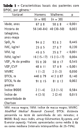 A DPOC é sabidamente uma doença passível de prevenção e tratamento, caracterizada pela limitação não completamente reversível do fluxo aéreo. Além disso, está bem estabelecido que a DPOC está associada a consequências sistêmicas que interferem negativamente no prognóstico da doença, incluindo a depleção de massa magra (MM),(1) intolerância ao exercício,(2) e o comprometimento do estado de saúde (ES).(3) Embora recentes estudos de vigilância em DPOC mostrem que a prevalência de DPOC e internações devido à doença aumentaram entre as mulheres,(4) existem poucos relatos comparando seu impacto e suas manifestações sistêmicas nos gêneros.(5-10) Os resultados desses estudos sugerem que, entre pacientes com DPOC, a percepção da dispneia, a intolerância ao exercício e o comprometimento do ES são mais elevados nas mulheres que nos homens.(5-10)