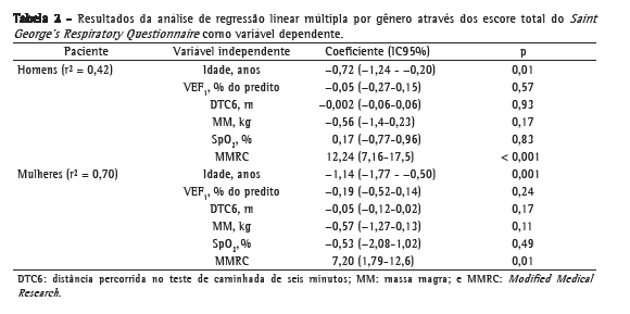 Como pode ser observado na Figura 1, as mulheres mostraram maior comprometimento do ES que os homens pelo escore total do SGRQ e por todos os domínios do SGRQ: total (51 ± 18% vs. 38 ± 19%; p = 0,002); sintomas (61 ± 22% vs. 42 ± 21%; p < 0,001); atividade (62 ± 18% vs. 49 ± 21%; p = 0,004); e impacto (41 ± 19% vs. 27 ± 18%; p = 0,001). Os resultados da análise de regressão linear múltipla por gênero estão apresentados na Tabela 2. A idade e a sensação de dispneia foram associadas ao escore total do SGRQ para ambos os gêneros (p < 0,05).