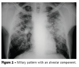 In view of the aforementioned facts, the role of chest X-ray in the clinical diagnosis of pulmonary tuberculosis in ICU patients remains uncertain, and it is possible that chest X-ray does not contribute as much as expected. In a case-control study evaluating 89 patients with pulmonary tuberculosis and 89 controls, the most common radiological pattern was consolidation, which was found in 61 patients (6.5%). In the multivariate analysis, a history of pulmonary tuberculosis was associated with clinical suspicion of tuberculosis, although the radiological patterns were not associated with that suspicion.(21)