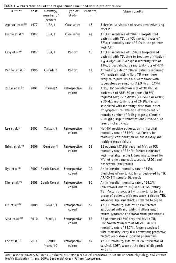 We searched the PubMed (Medline) and LILACS (SciELO) databases by using combinations of the following keywords: tuberculosis; intensive care unit; respiratory failure; mechanical ventilation; hospitalization; and respiratory distress syndrome. The inclusion criterion was as follows: accessible articles in Portuguese, English, Spanish, Italian, or French published up until October of 2011 and containing the abovementioned keyword combinations. We identified some studies of tuberculosis patients requiring ICU admission or with acute respiratory failure (or both), and most of them were case series or retrospective studies. Table 1 summarizes the characteristics of the major studies. Case reports were not included in the table.