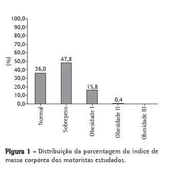 Do total dos motoristas, 47,8% apresentavam sobrepeso e 15,8% obesidade. A Figura 1 mostra a distribuição do IMC na população estudada, e observa-se que a maioria dos motoristas está na faixa de sobrepeso. Por outro lado, apenas 9,6% dos motoristas relataram ser hipertensos e 80,1% referiram nunca fumar.