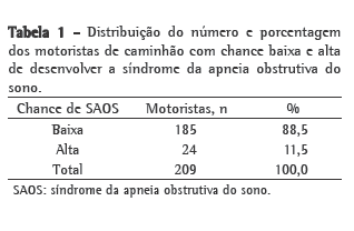 Para o levantamento dos dados, os motoristas responderam um questionário constituído de dados sociodemográficos, escala de avaliação de atividade física(23) e escala para estimar a chance de desenvolver a SAOS.(16)