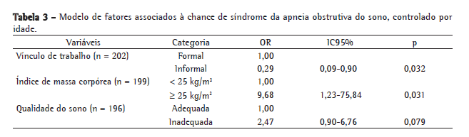 < 0,20 (vínculo de trabalho, IMC, qualidade do sono, área de trabalho e turno de trabalho). O modelo foi ainda controlado pela idade (Tabela 3).