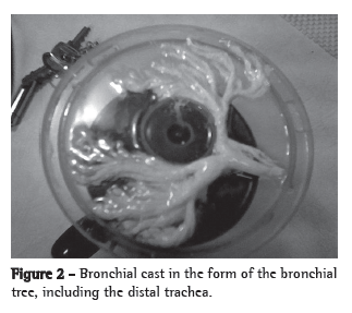 In plastic bronchitis, the casts can be analyzed after being exteriorized through coughing, bronchoscopy or surgery.(5) The format of the mucoid bronchial casts can be segmental, lobar or, in rare cases, pulmonary.(6)