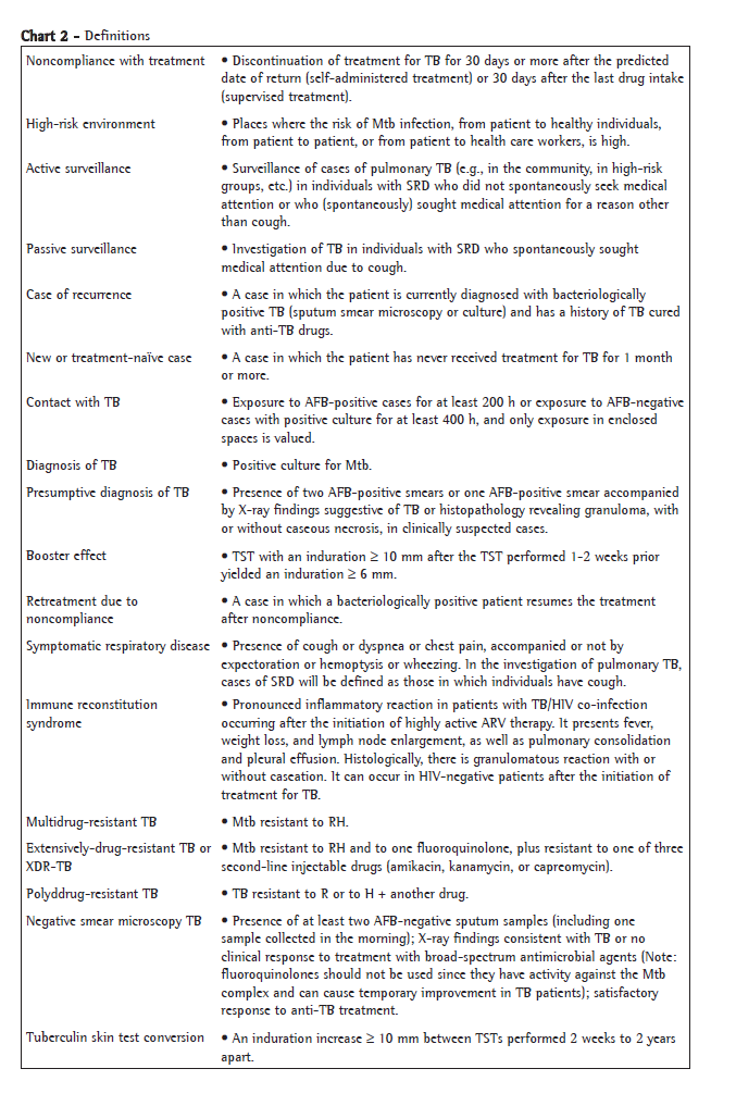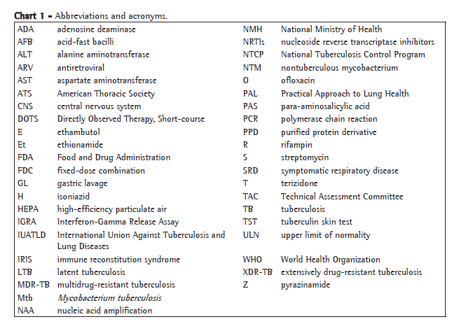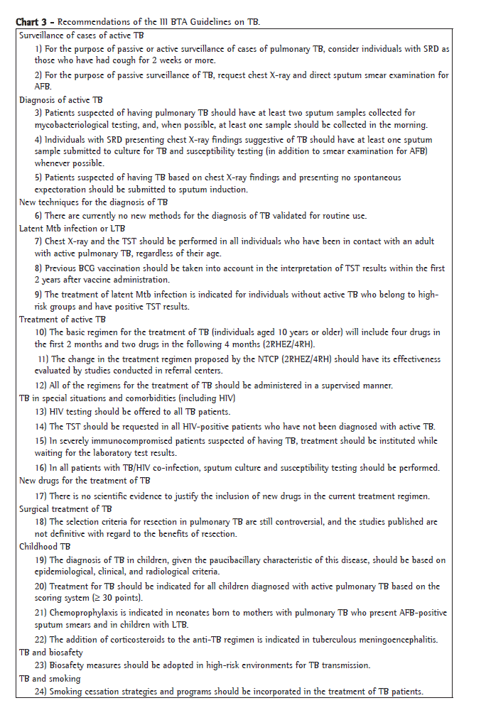 The abbreviations and acronyms used in the III BTA Guidelines on TB are presented in Chart 1, the definitions are presented in Chart 2, and the recommendations are presented in Chart 3.